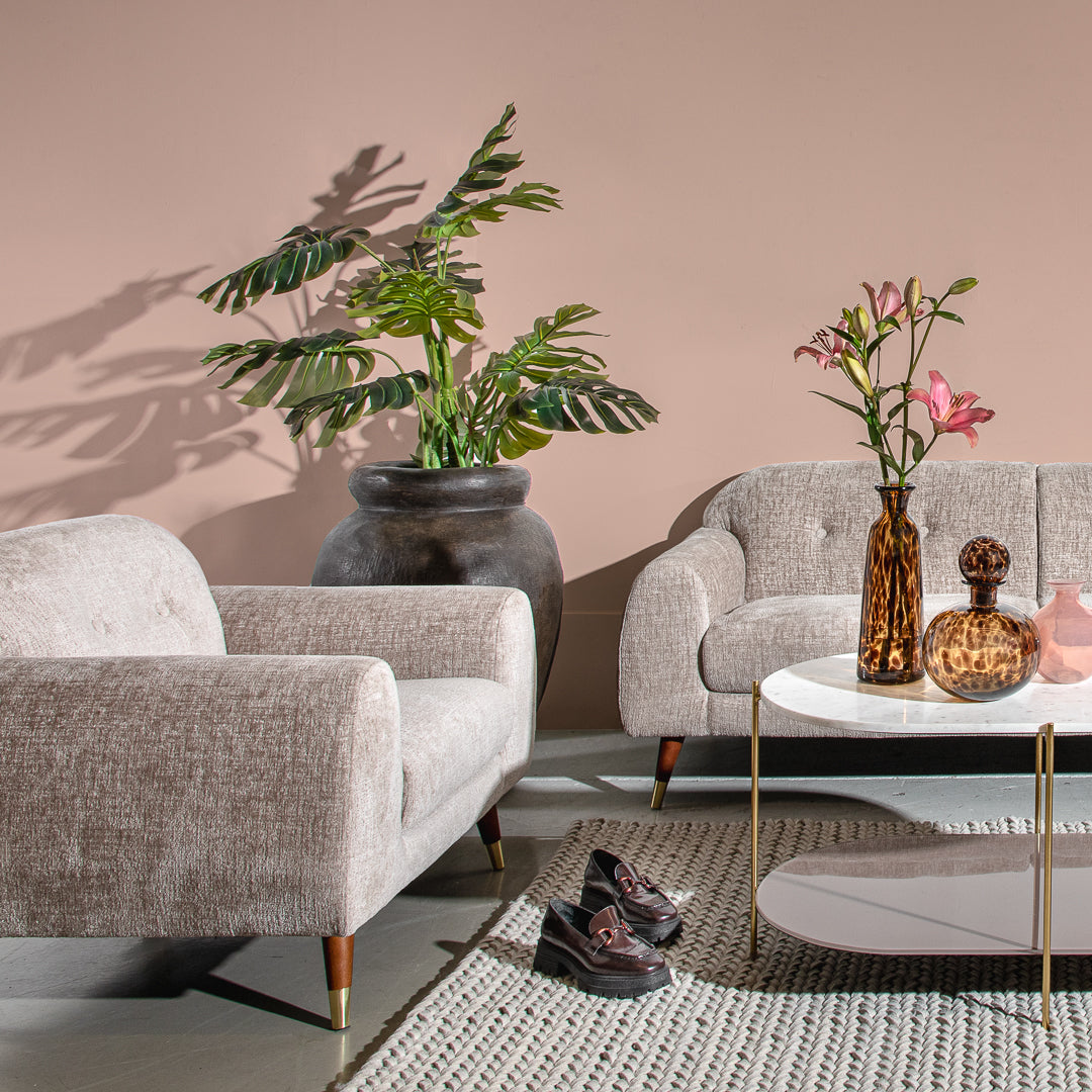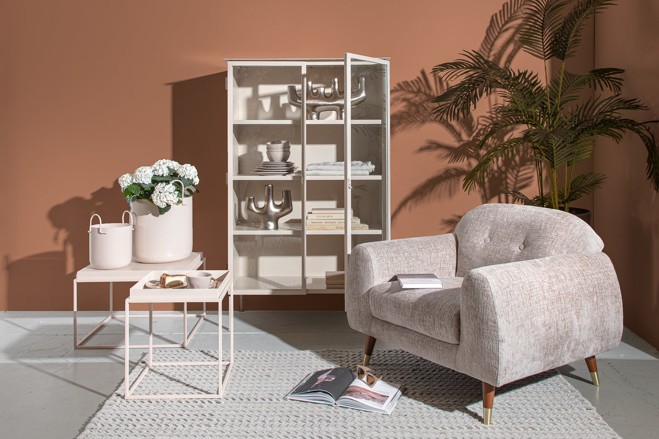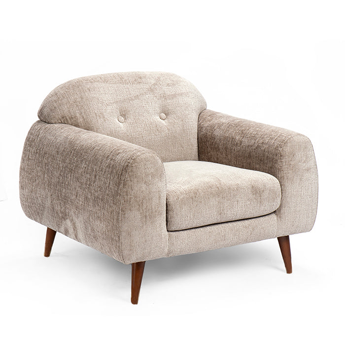 כורסא ברטה מפנקת בצבע בז’. כורסאת ישיבה עוטפת, בגימור עגול וקימורים רכים הניצבת על רגלי עץ זוויתיות.