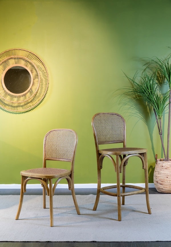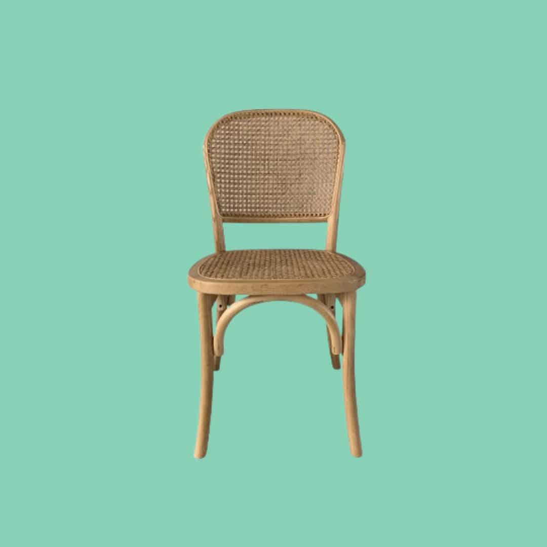 כיסא אוכל בעיצוב כפרי בשילוב עץ אלון מלא ומושב ראטן טבעי איכותי.