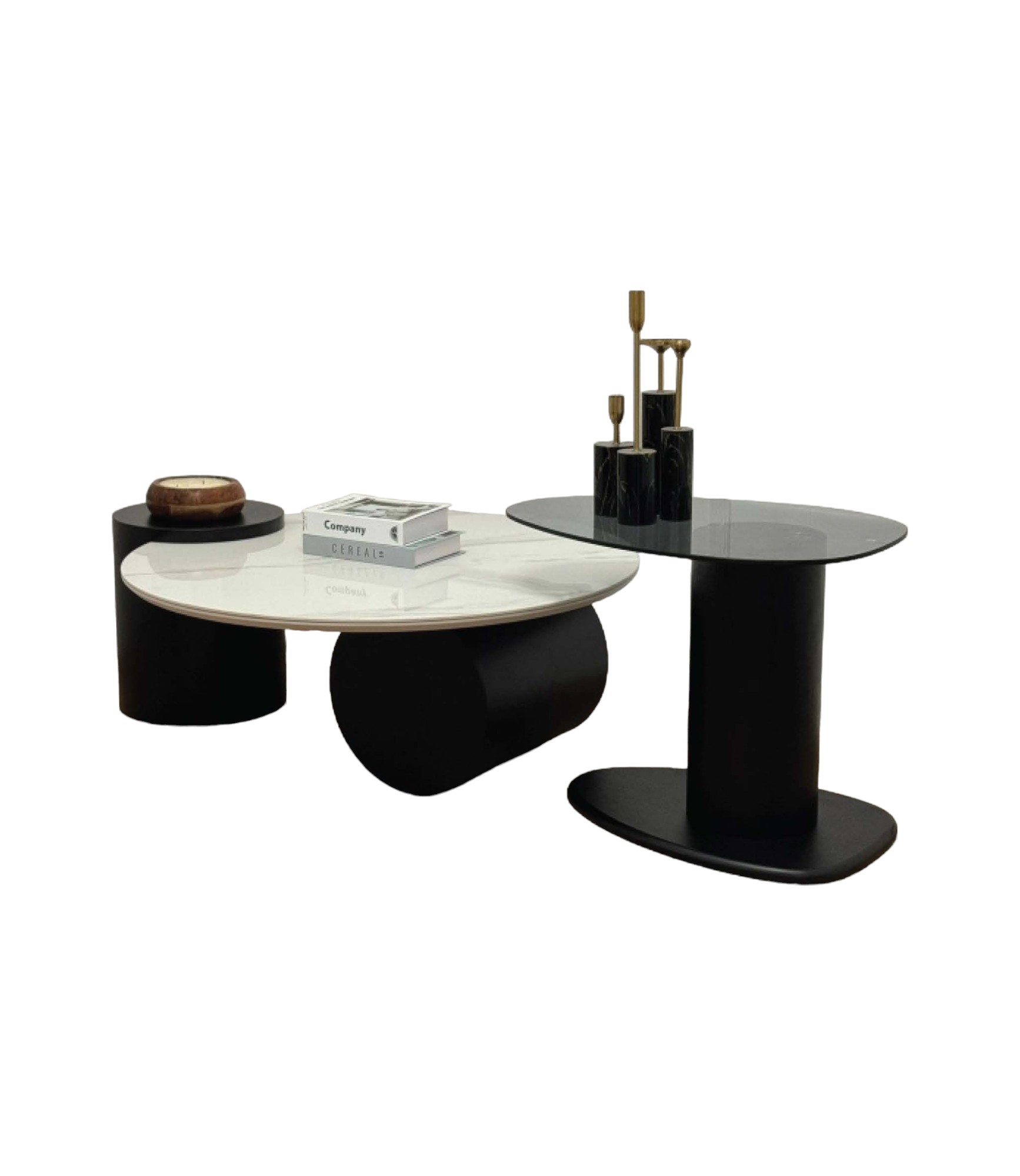 שולחנות בעיצוב מודרני בשילוב פורצלן עץ מושחר וזכוכית מושחרת.
