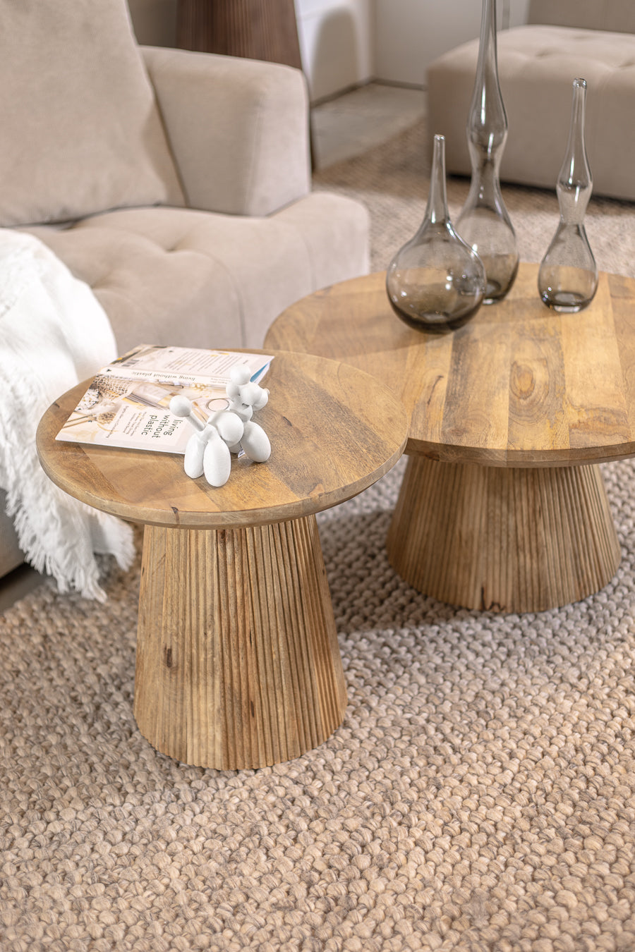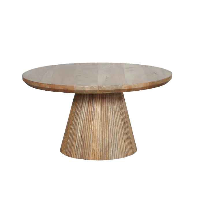שולחן לוסט קוני עגול מעוצב עץ מנגו בהיר. שולחן סלון המורכב פלטה עגולה ורגל קונוס עבה.
