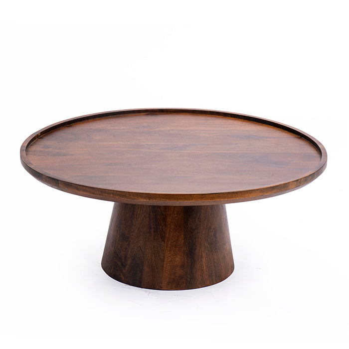 שולחן סלון ייחודי המעוצב פלטה עגולה שטוחה הנישאת על רגל עץ עבה.