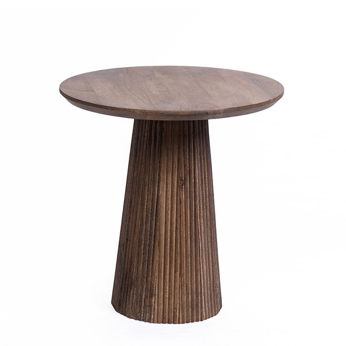 פריט ריהוט ייחודי המעוצב פלטה עגולה שטוחה הנישאת על רגל עץ מדוגמת פסי עץ.