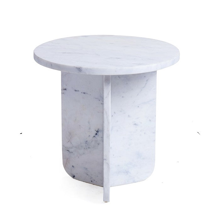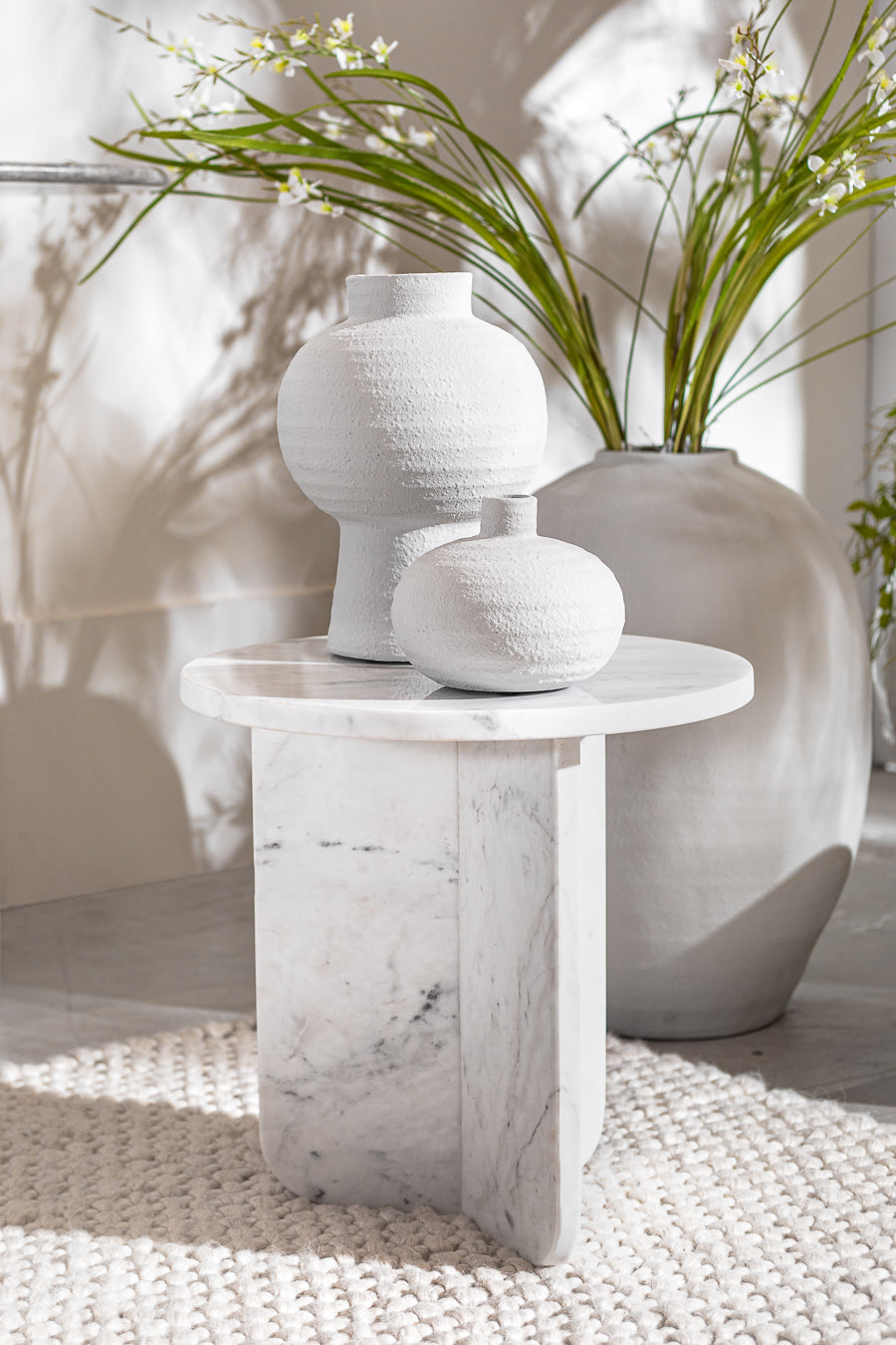 שולחן מארבל סוהו פרופיל אמורפי בגוון שיש בהיר. שולחן שיש מעוצב מקשה אחת, מורכב פלטה עגולה וניצבת על בסיס 4 כנפיים מסותתות ב-אבן.