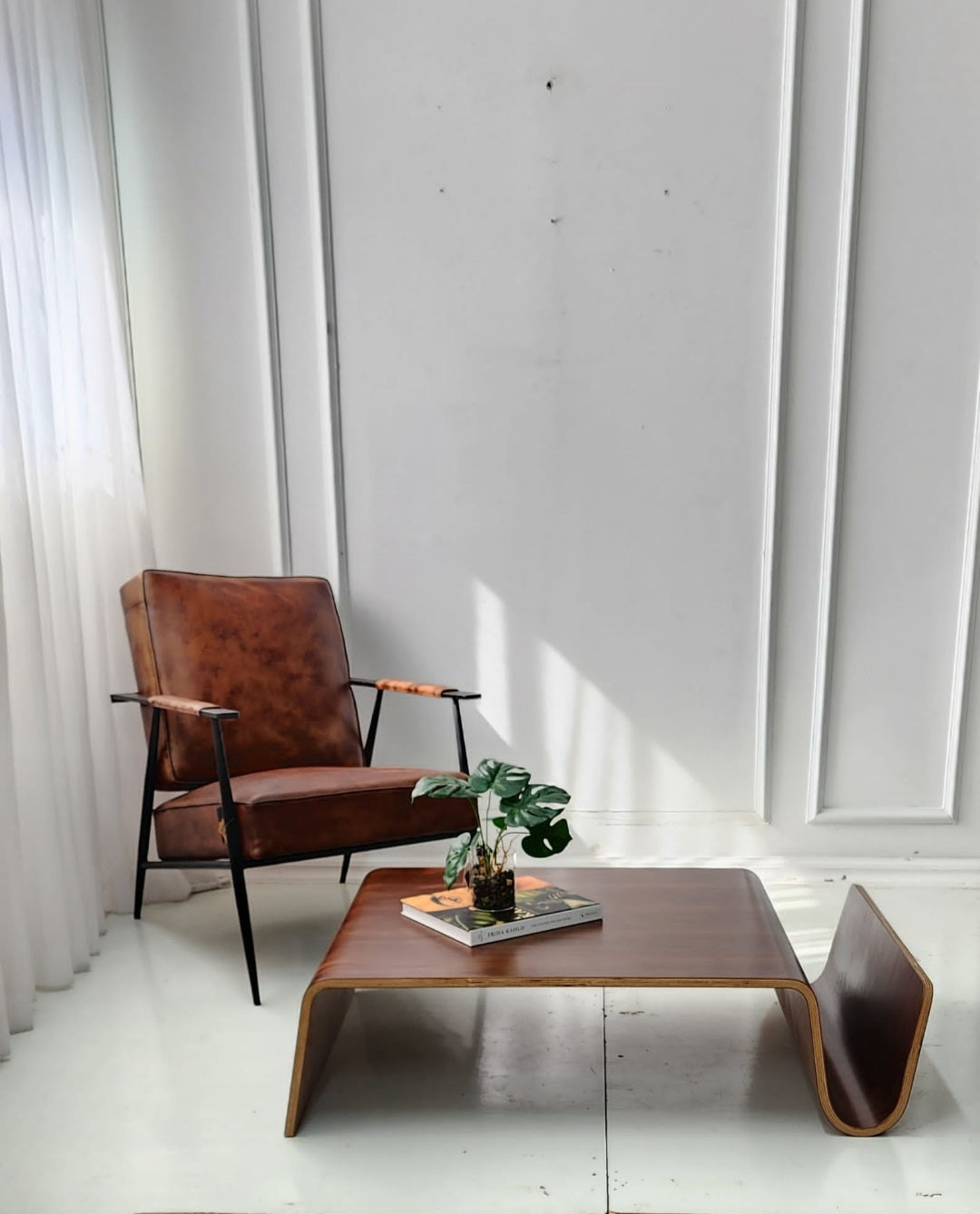 שולחן סלון מעץ אלון מכופף בגוון חום אגוז ובציפוי שכבת פורניר אלון המדגיש את היופי הטבעי של העץ.