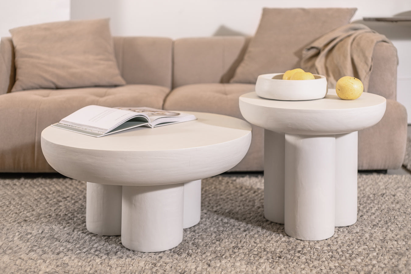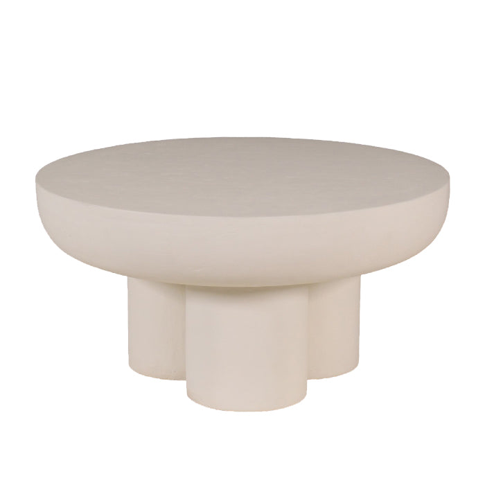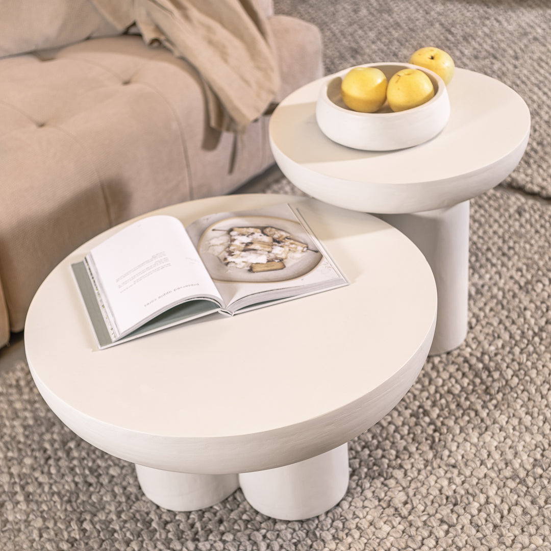 שולחן צד ספייס בצבע אייבורי. שולחן אירוח המעוצב פלטה עגולה עבה, הנישאת על שלישיית רגלי אלפנט קצרות.