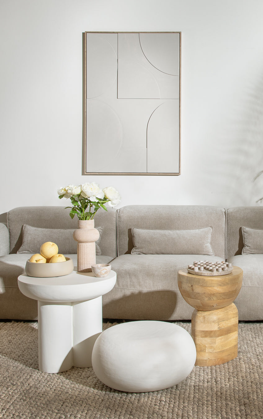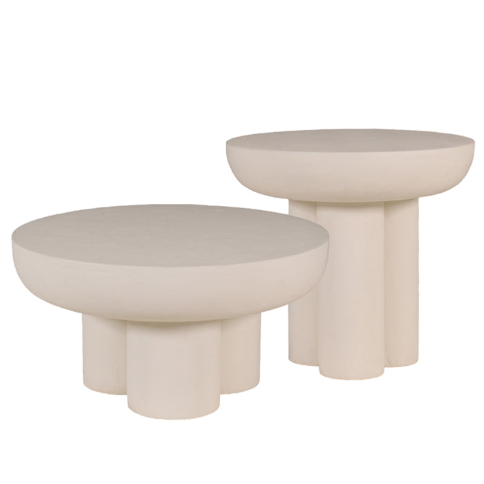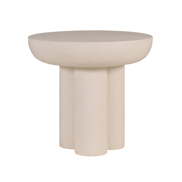 שולחן צד ספייס בצבע אייבורי. שולחן אירוח המעוצב פלטה עגולה עבה, הנישאת על שלישיית רגלי אלפנט קצרות.